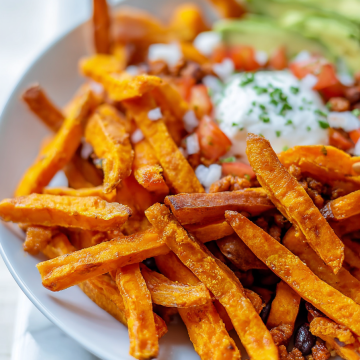 Can I use regular potatoes instead? Yes, but you’ll lose the natural sweetness and nutritional benefits. Russet potatoes work well if you prefer a more traditional loaded fries experience.