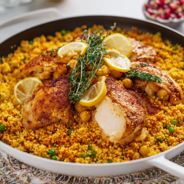• Transfer the skillet to the oven and bake uncovered for 15 minutes, until the couscous has absorbed the broth and the chicken reaches an internal temperature of 165°F (74°C).