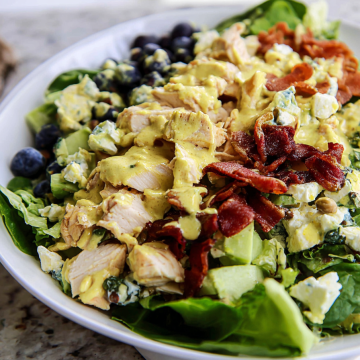 Start with a bed of chopped romaine lettuce. Top with the sliced grilled chicken, crumbled bacon, gorgonzola cheese, slivered almonds, fresh blueberries, and dried cranberries. Drizzle generous amounts of the honey mustard dressing on top. I usually serve extra dressing on the side so everyone can add more if they’d like.